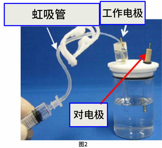RHEK的操作步骤如下。在强酸性溶液的情况下,经过虹吸把强酸性溶液吸入RHE本体(图2),通过阴极电解产生氢气并存储氢气于电极本体(图3)。然后,你可以执行你的主要目的,把曾经用于电解产生氢气的工作电极端子连接到测试溶液的工作电极,然后把曾经连接到对电极的参比端子连接到参比电极(图4)。