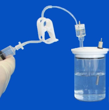 "一次性注射器"连接到 "硅胶管 "开口的一端并确认 "管夹"为松开状态后,拉注射器的柱塞让溶液填充在电极的腔内。